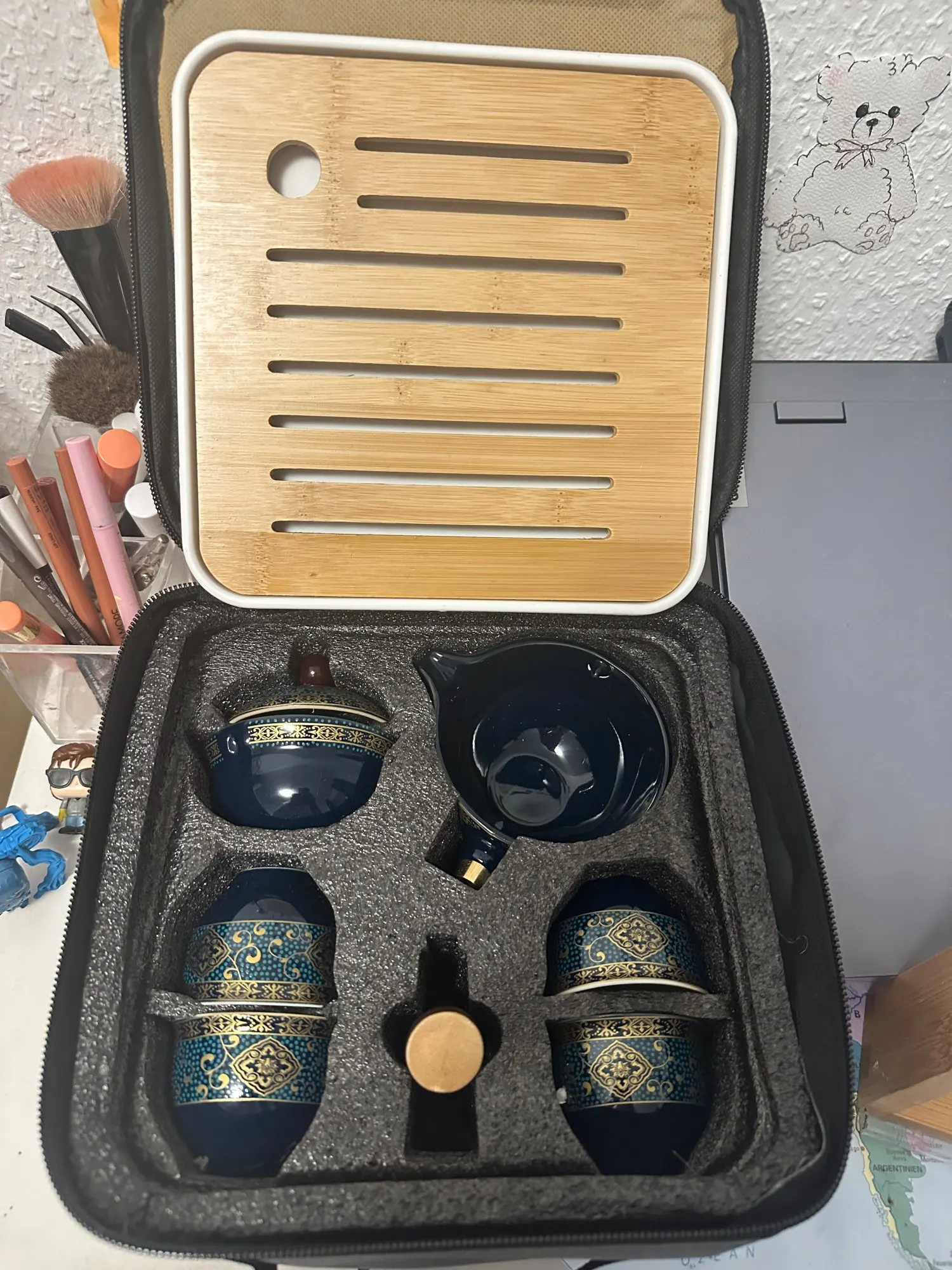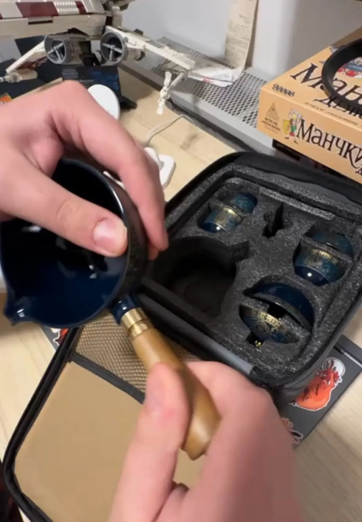 Very cool and stylish set! Convenient case. Beautiful patterns on the cups, it's cool that the set includes a board. But for some reason, the cups arrived dark inside instead of white, but the person receiving it as a gift liked it even more, thank you! I'm taking off one star only because it doesn't match the product photo, but otherwise everything is great! Packed very securely.